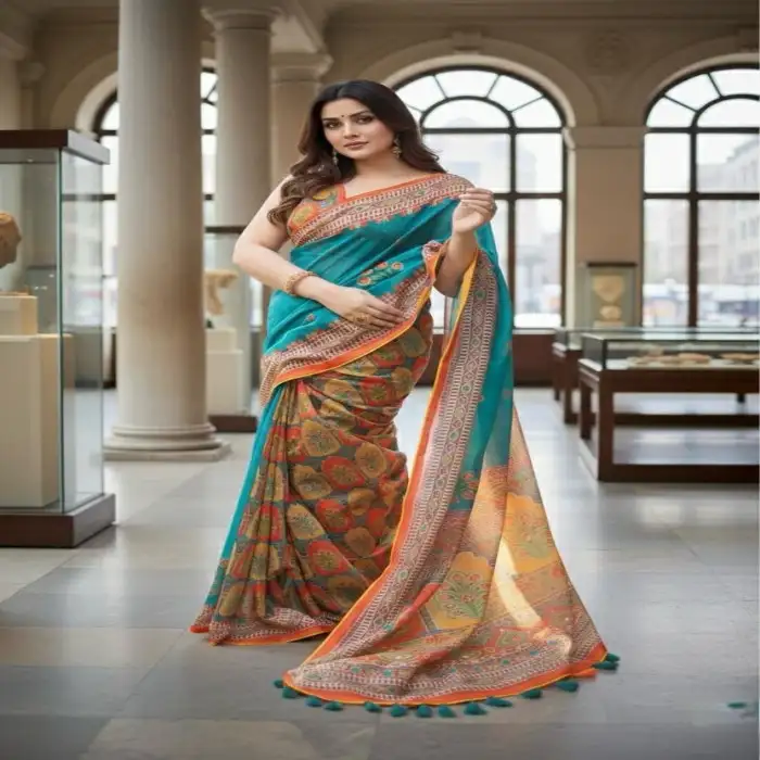 ডিজিটাল প্রিন্টেড সেমি মসলিন শাড়ি – এলিগ্যান্ট সি গ্রিন ও মাল্টিকালার ফ্লোরাল ডিজাইন