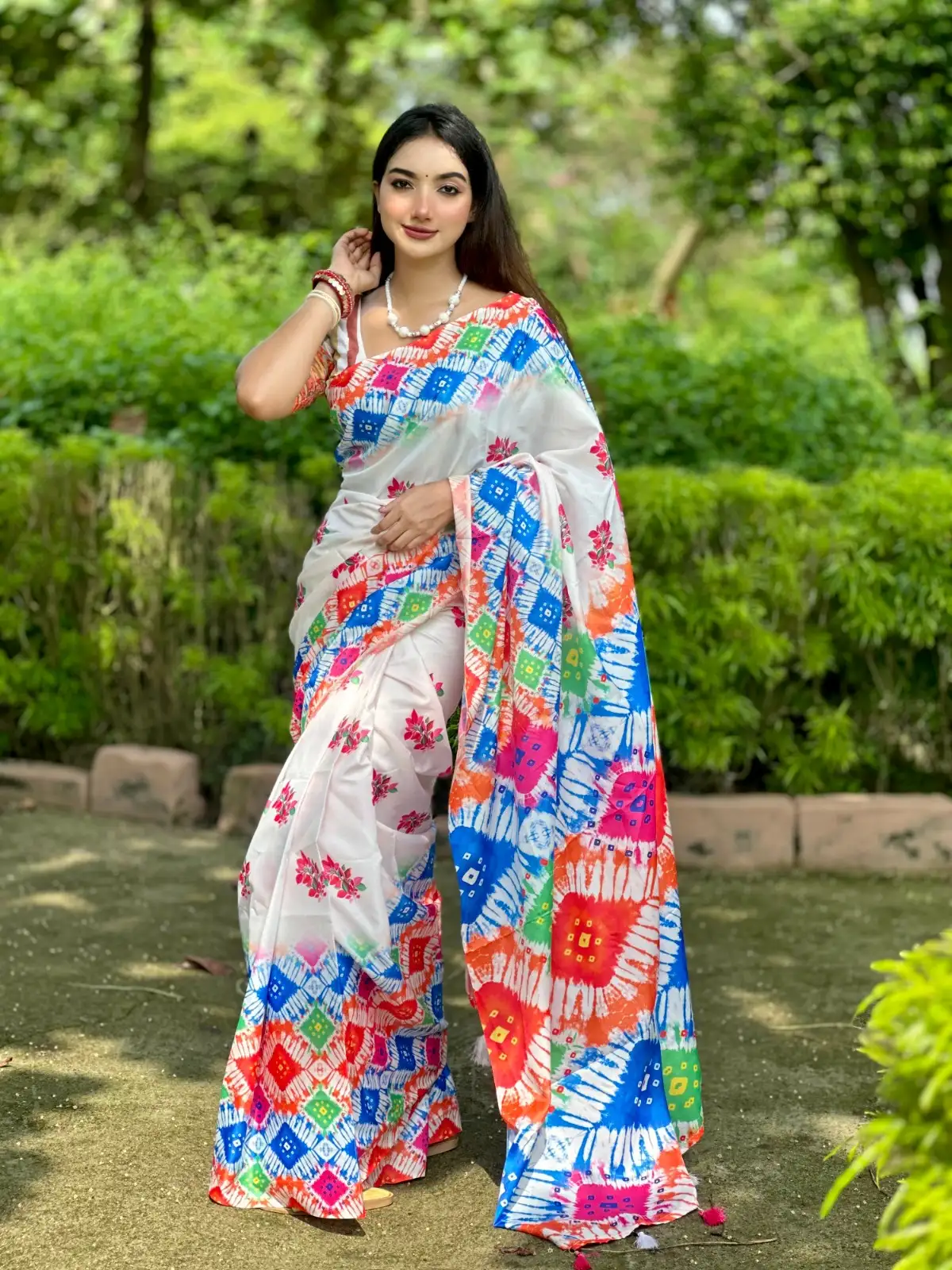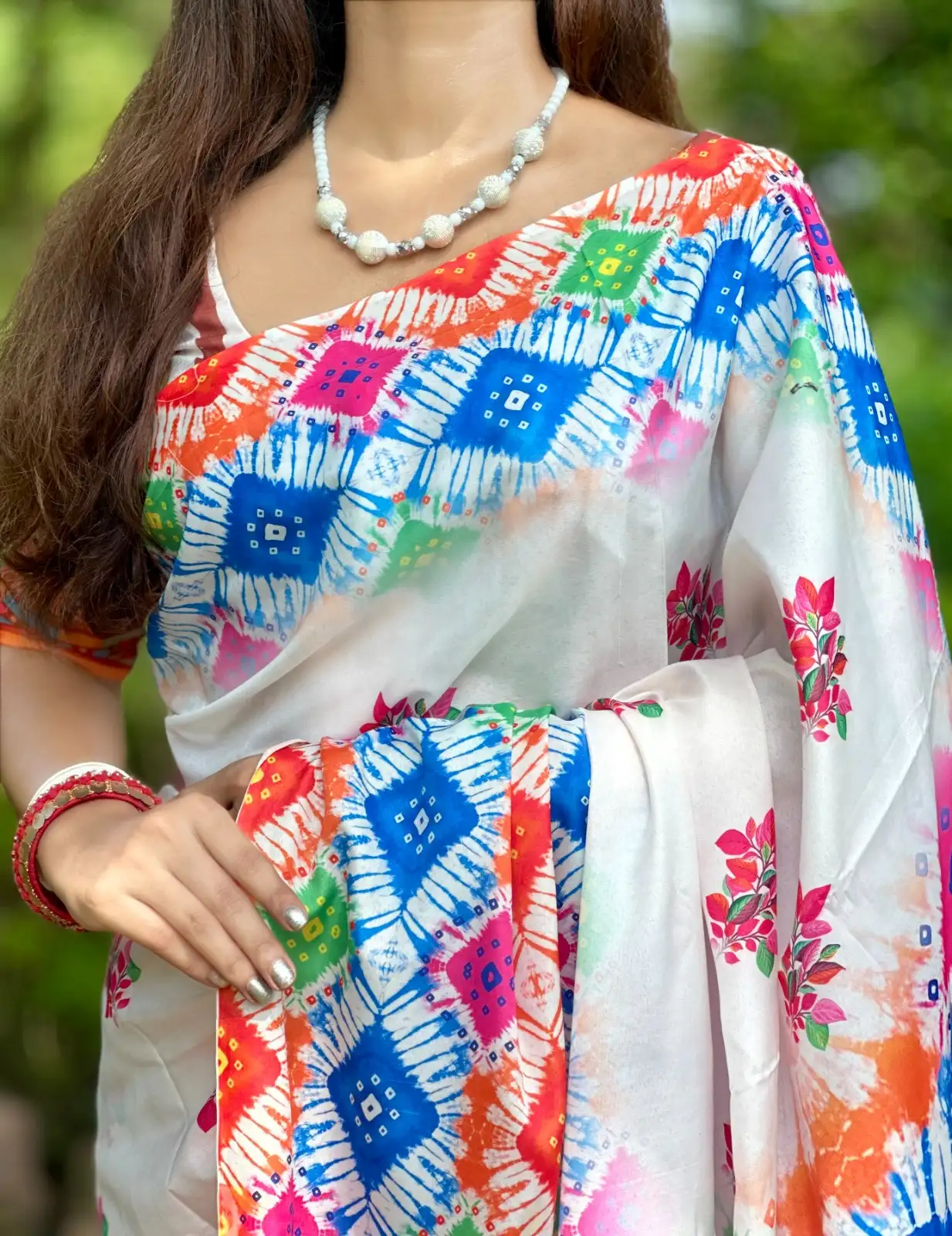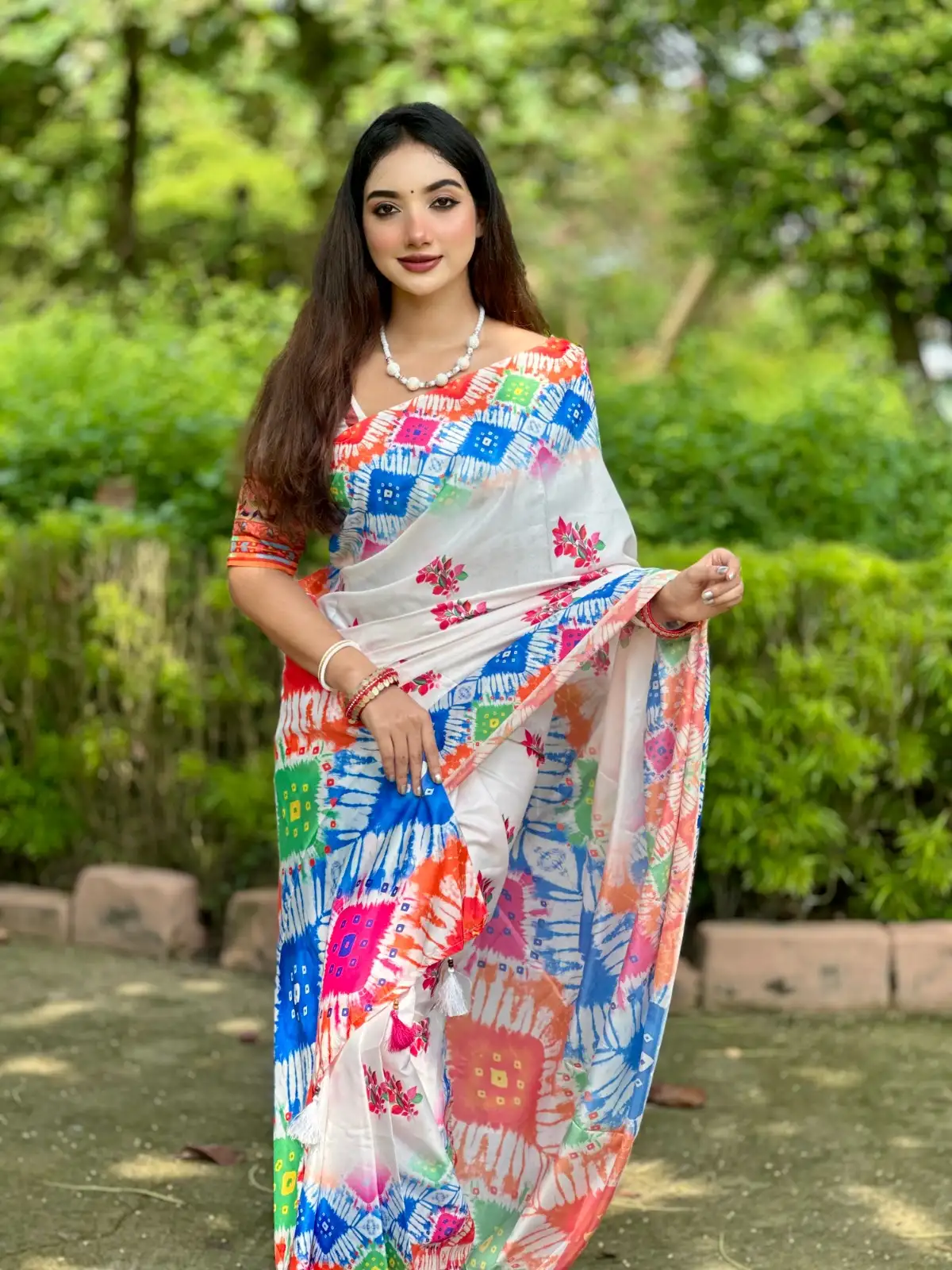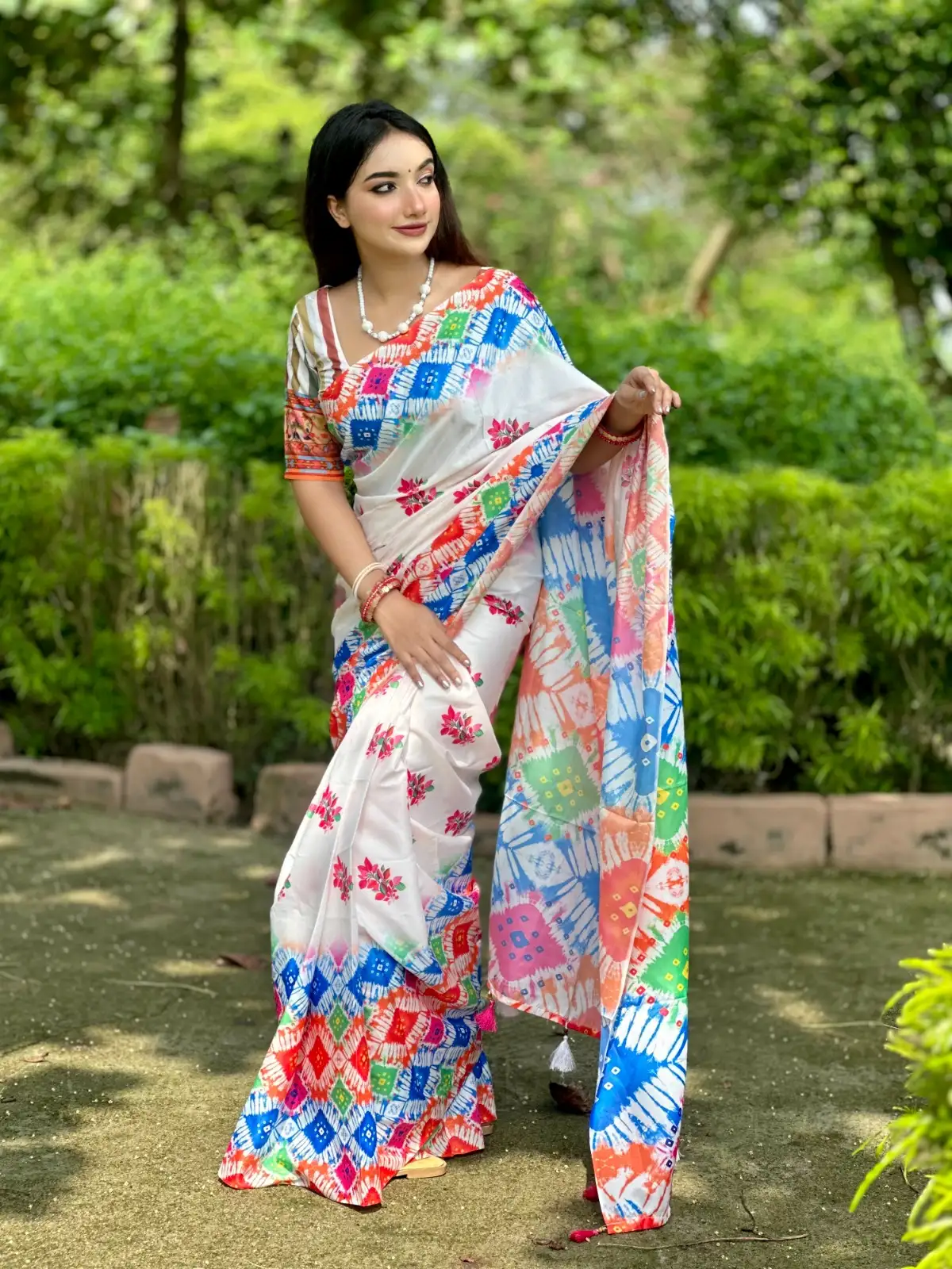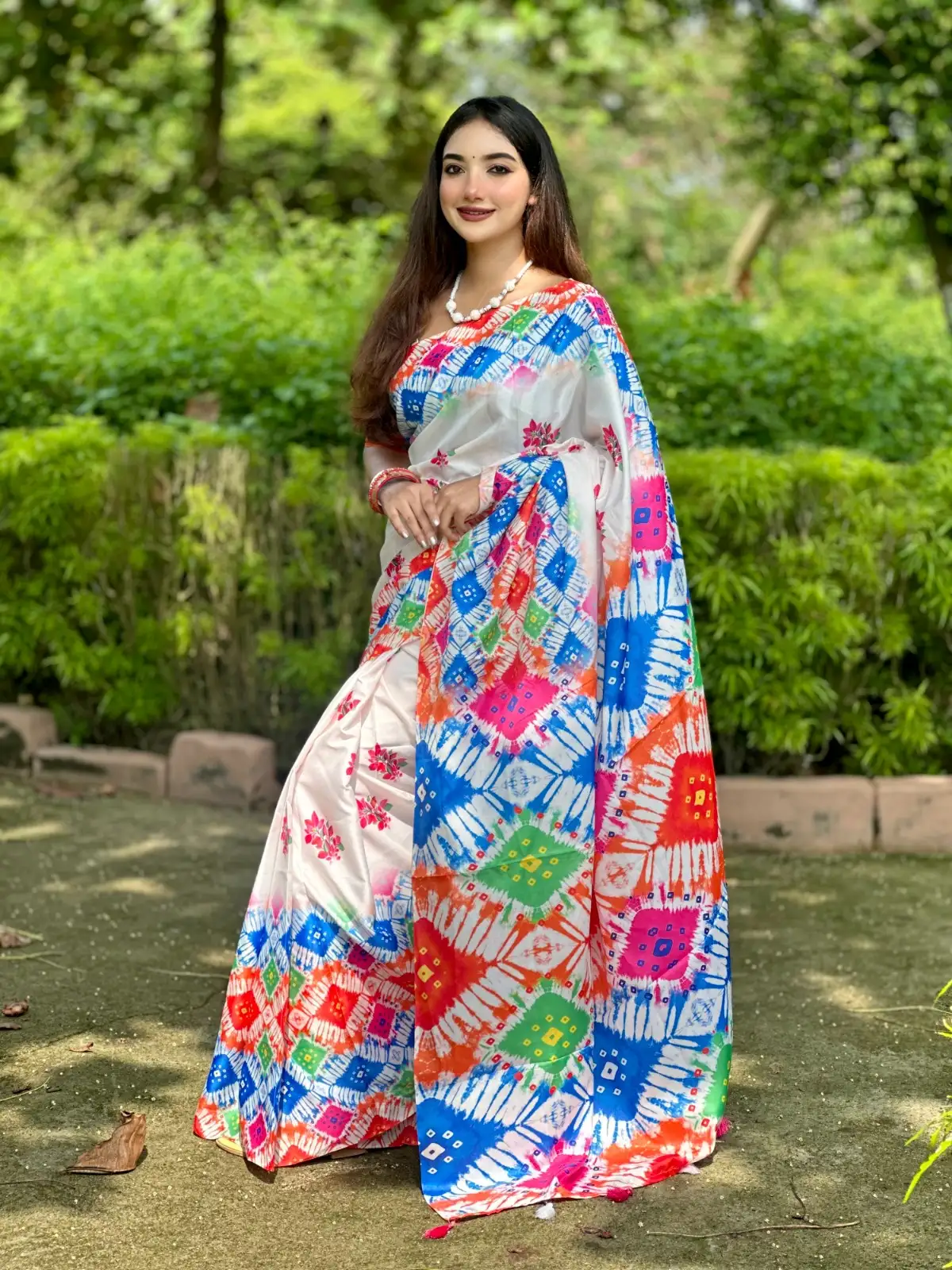 এই শাড়িটি ডিজিটাল প্রিন্টের চমৎকার নিদর্শন ও সফট সিল্ক ফ্যাব্রিকের আরামদায়ক ছোঁয়ায় হয়ে উঠেছে একেবারে প্রিমিয়াম।
